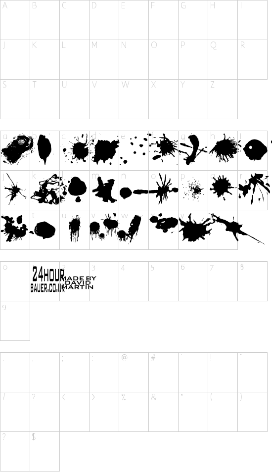 :: Zeichenübersicht Alle Informationen zur Schriftart Split splat splodgeDu findest auf dieser Seite alle notwendigen Informationen, wie den kostenlosen Download des Font, eine Gesamtvorschau aller Zeichen der Schriftart Split splat splodge und einen Schriftgenerator, mit dem du eine individuelle Vorschau generieren kannst. Klicke dazu einfach in der Leiste oben auf "Individueller Vorschautext".Vergiss auch nicht einen Kommentar zu hinterlassen, wenn dir der Font Split splat splodge gefällt! Neu: Immer die neusten kostenlosen Fonts? Füg uns auch bei Facebook und Google+ hinzu! Sie wollen die Schriftarten auf ihrer Homepage, in Druckerzeugnissen oder kommerziell einsetzen? Hier finden Sie Informationen!
